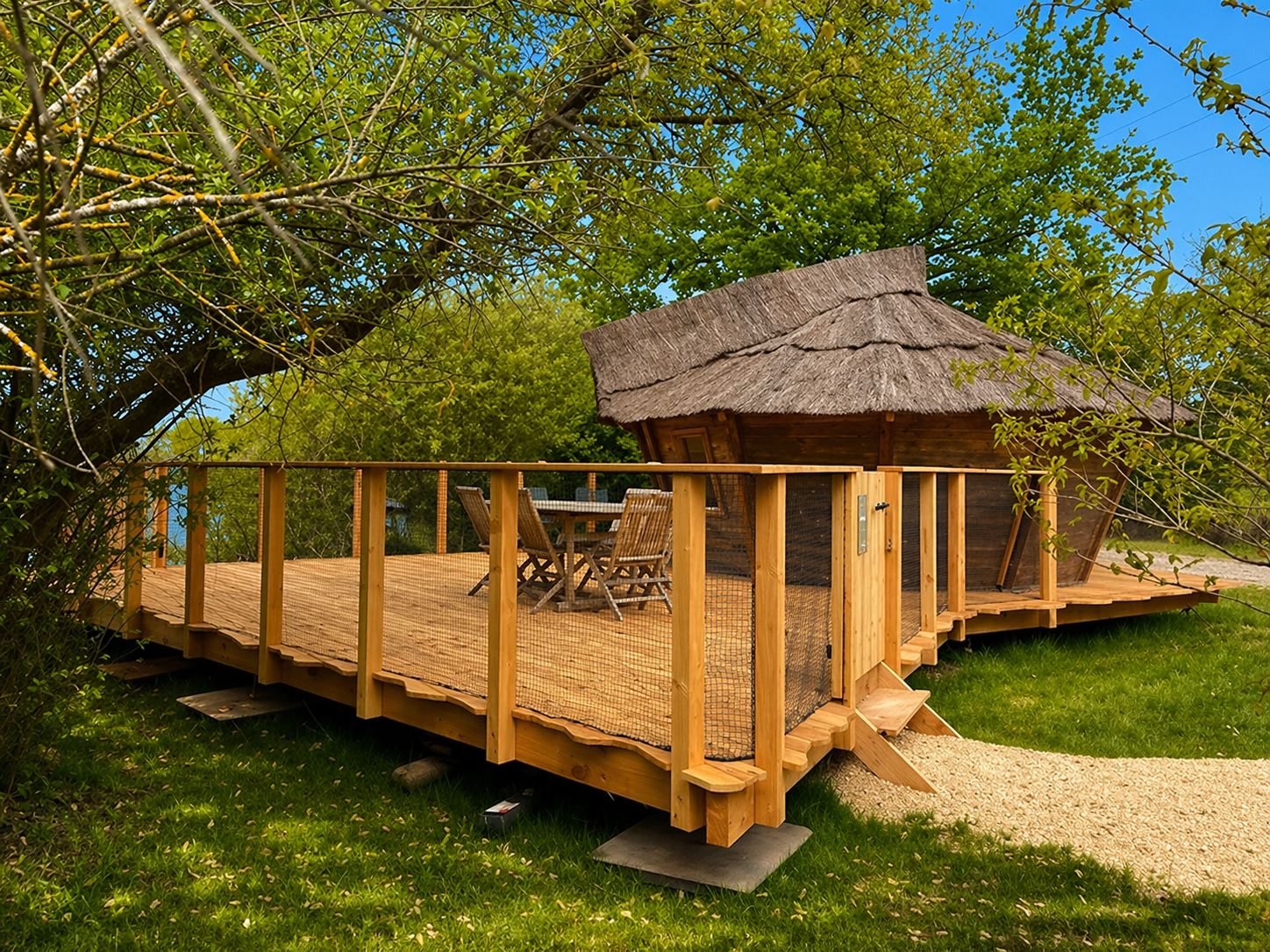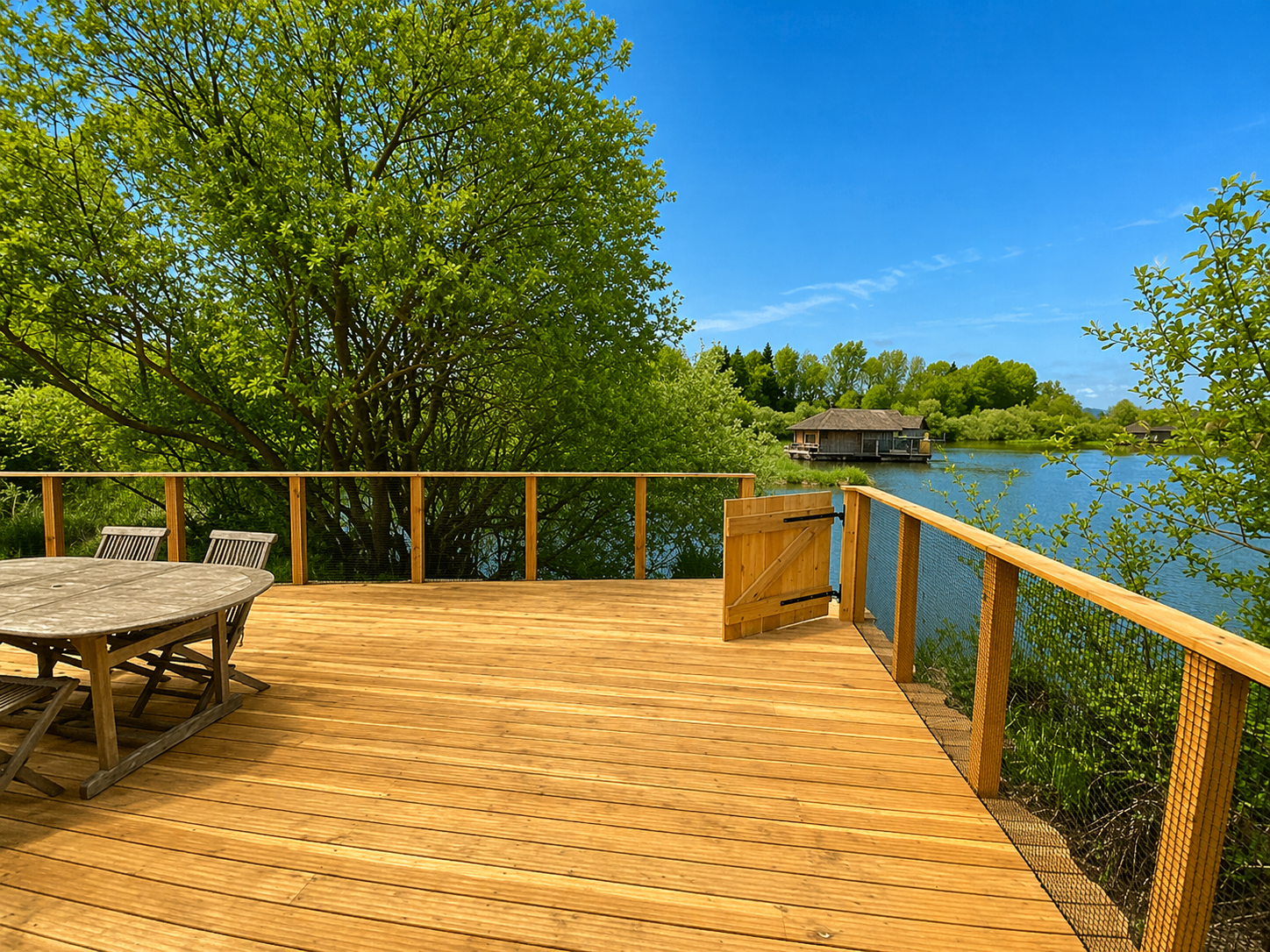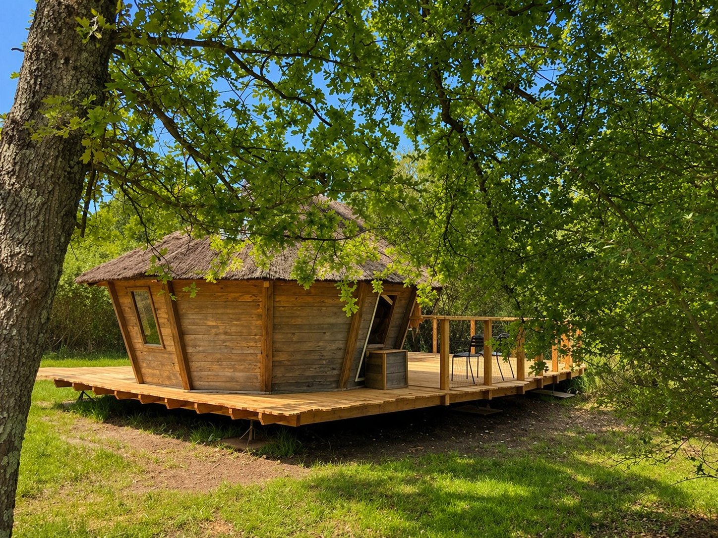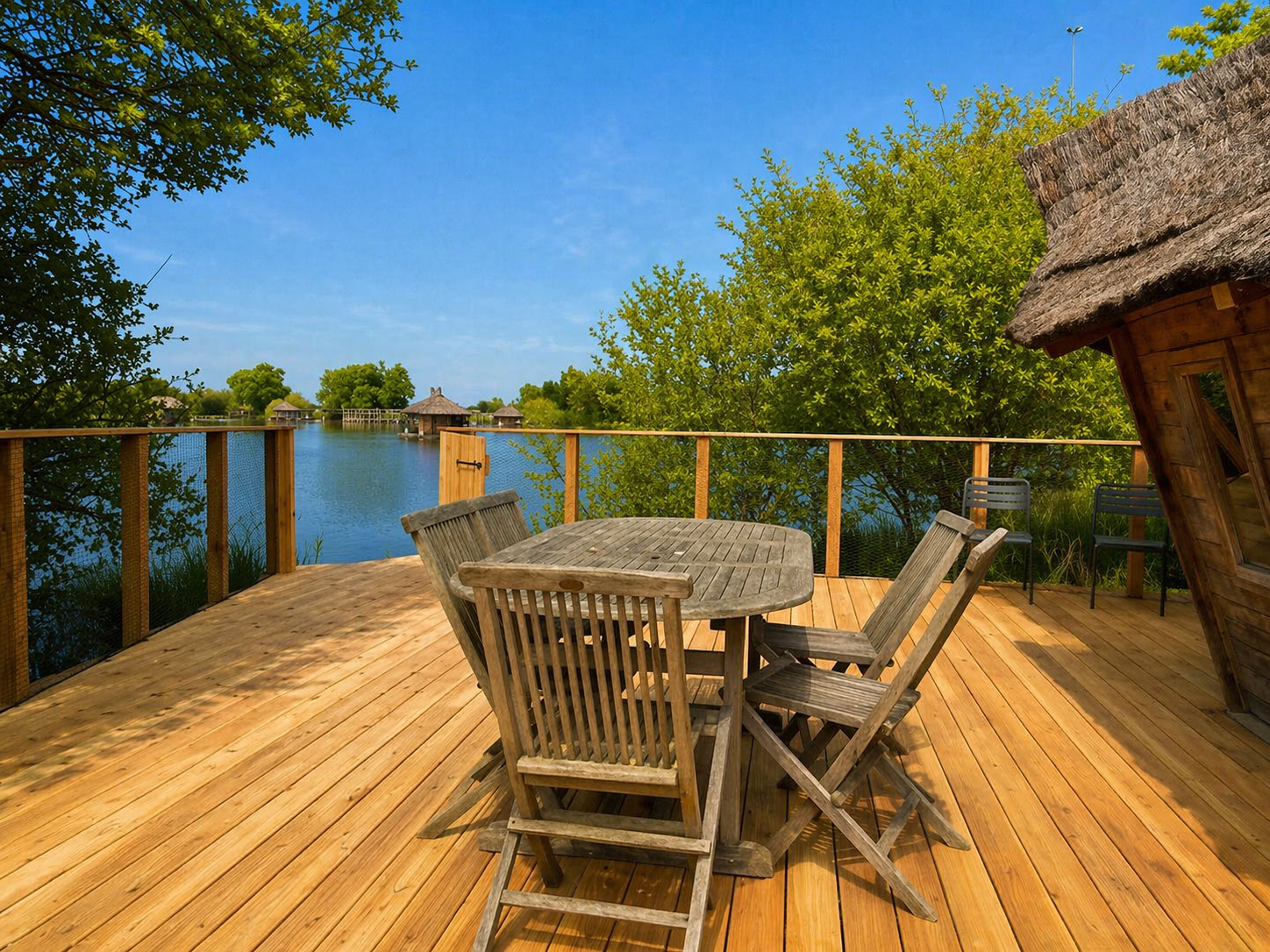 La terrasse d’Amarante est à 50 cm du bord de l’eau. Située proche de la zone Natura, la cabane donne sur l’étang avec une vue sur les cabanes flottantes, le port, et la zone de nidification naturelle du Village. Vous pourrez même, si vous le souhaitez, accéder à votre cabane avec une barque : nous avons prévu un accès « eau » direct depuis la terrasse.